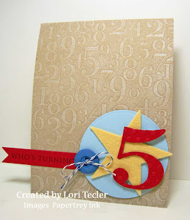 I used Papertrey Ink's By the Numbers impression plate to make the number background. The plate was inked with white pigment ink, then run through my Big Shot with kraft cardstock. I love the subtle look!I built the rest of the card around a Spring Moss circle. I used bold shapes and colors with lots of texture. I added a Harvest Gold die cut felt star and a die cut "5" to the circle. The 5 is embossed with a dotted pattern for more texture. The "who's turning" sentiment from PTI's Big Birthday Wishes set is stamped in black on a double-ended banner die cut. It's anchored to the blue circle with a blue button that's tied with baker's twine.