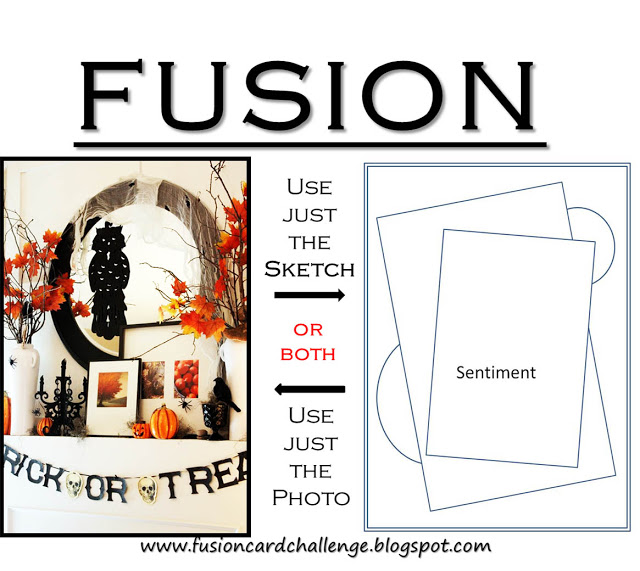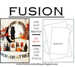 Here's my card for the current Fusion challenge. I combined the sketch with the photo's Halloween theme and color scheme for my card.