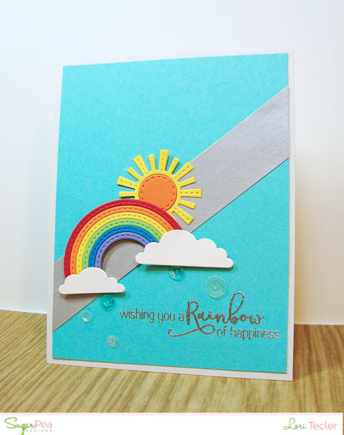 I used the dies to cut the rainbow, sun, and clouds from assorted cardstock scraps. I love the stitched detailing on the dies! The die cut pieces were arranged on a blue cardstock panel with a diagonal shiny silver cardstock strip stretching from side to side. To add dimension, I used foam tape beneath the rainbow and clouds. Once all of the elements were in place, I used silver ink to stamp the "wishing you a rainbow of happiness" sentiment near the bottom of the panel. I heat embossed it with silver embossing powder for an extra pop. A few clear and blue sequins from the Sea Spray sequin collection were arranged around the sentiment and beneath the cloud. The finished panel was adhered to a pale gray card base.