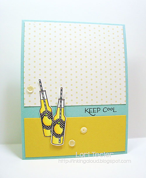 I covered a blue card base with a piece of golden yellow dotted paper on top and a strip of solid golden yellow on the bottom, leaving a space between them to stamp the sentiment. I stamped the lemonade bottle from the Clear and Simple Stamps Summer Fun stamp set twice on white cardstock and colored the images with Copic markers, then cut them out. They're adhered to the cardfront using foam tape for a little dimension. The set's "keep cool" sentiment was stamped to the right of the bottles in black ink. I added a touch of sparkle to the simple design with a trio of pale yellow sequins scattered around the bottles.