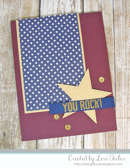 I built the card on a burgundy card base. The navy polka dotted panel, matted on sparkly gold paper and placed on top, adds whimsy to the design. With all the dark colors, the dots were a nice way to lighten things up, too. I substituted the layout's round panel with a gold stitched star die cut, adhered at the bottom right corner of the patterned panel with foam tape. I stamped the "you rock" sentiment from the Lil' Inker Designs Seriously Awesome stamp set in gold ink on a narrow navy strip, then heat embossed the text in gold so it would pop against the background. It was put in place with more foam tape. A trio of gold sequins surrounds the star for extra emphasis.